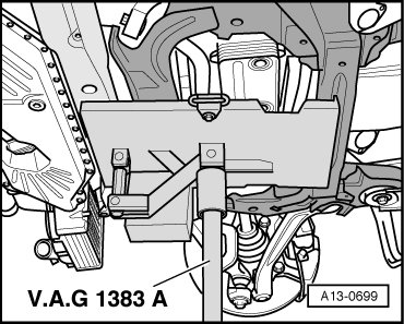 - Place the (VAG 1383A) with a wooden block under the subframe and press lightly against.