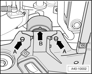 • There are spacers - arrow B - between the subframe and the front transmission mount so the two components can be assembled without tension. The gap dimension between the transmission mount and subframe must be established again when installing.