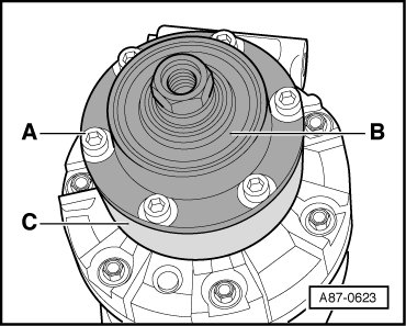 - Position drive plate with overload safeguard - B - onto drive plate - C -.
