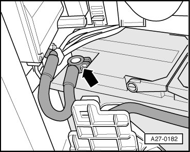 - With ignition switched off, disconnect Battery Ground (GND) cable - arrow -.
