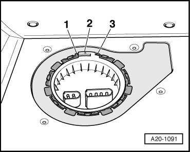 • The tab - 2 - on locking flange must lie between tabs - 1 - and - 3 - on fuel tank.