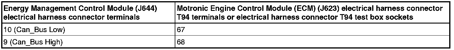 - Using a Multimeter, check the Energy Management Control Module (J644) electrical harness connector to the Motronic Engine Control Module (ECM) (J623) electrical harness connector T94 or the electrical harness connector T94 for resistance.