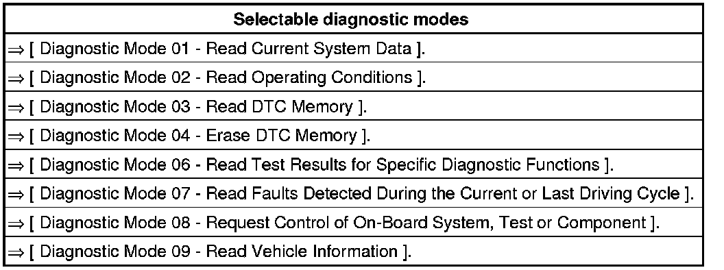 The information provided in Modes 01 through 09 displays the various levels of emission related data that may be monitored, as well as the ability to retrieve and read stored DTC trouble codes , erase stored DTC trouble codes, generate readiness codes, and select the various PIDs and Test-IDs used within the modes to monitor the engine, and emission related component parameters.