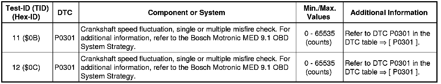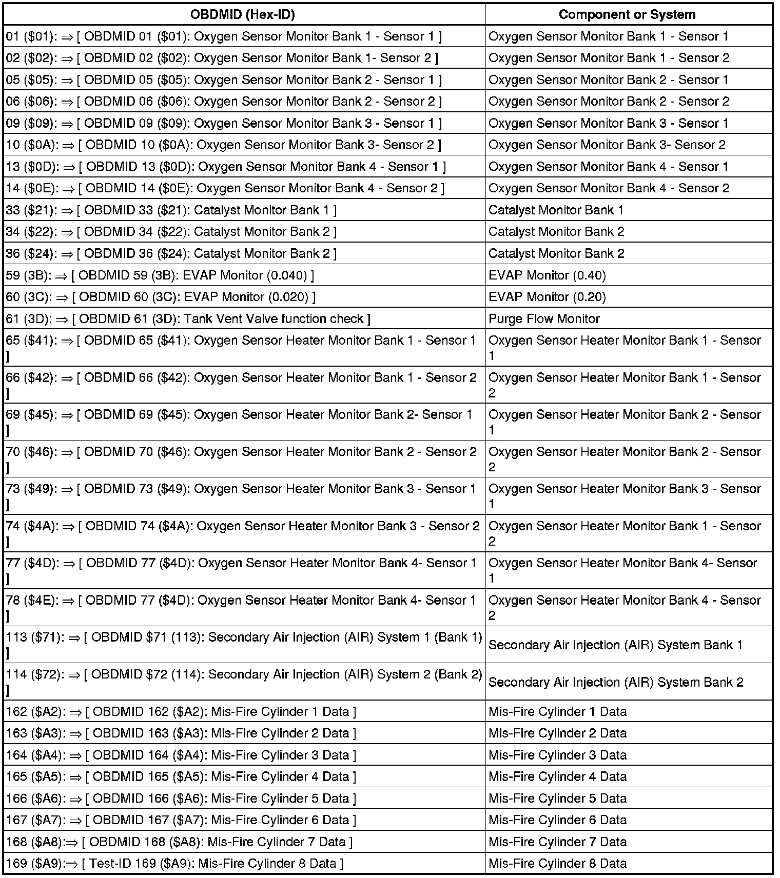 • Depending on scan tool and protocol used, the information in diagnostic mode 01 may be referred to by different names such as Test-ID (TID), Hex-ID, Component-ID (CID), or On-Board Diagnostic Monitor Identifier (OBDMID).