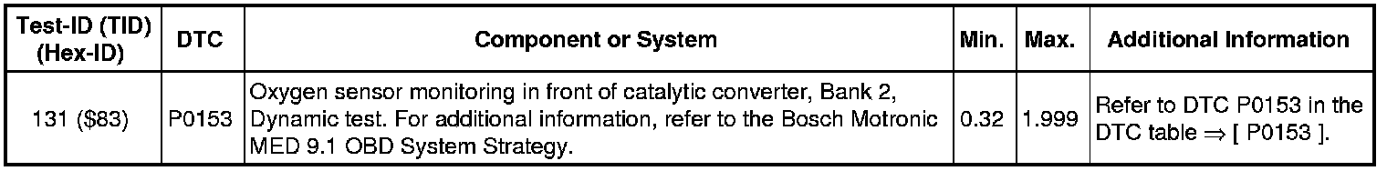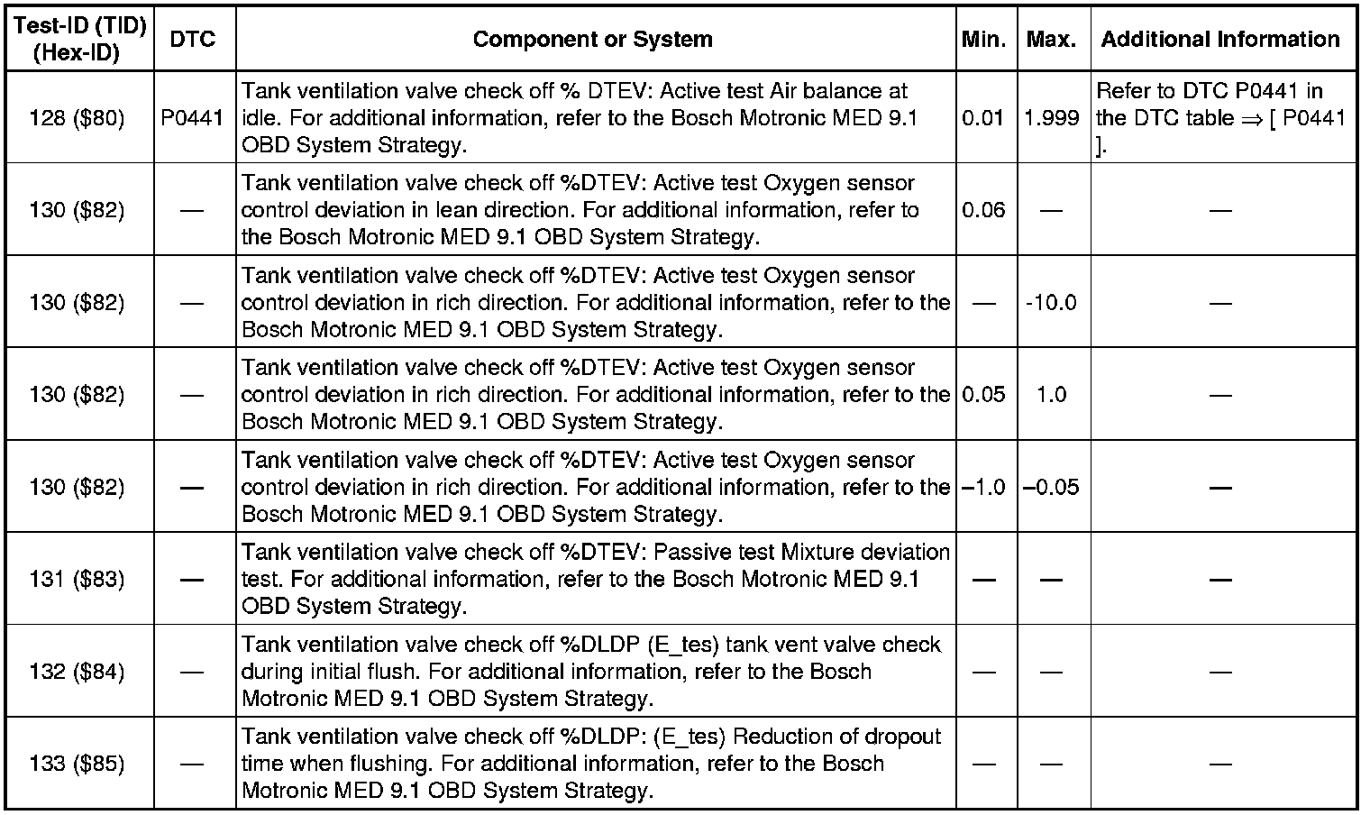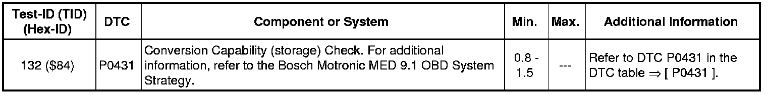 - If any of the components or systems fail to meet the specified values, refer to Diagnostic "Mode 03: Interrogating Fault Memory" to check for stored DTC's or the corresponding diagnostic repair procedure. Diagnostic Mode 03 - Read DTC Memory
