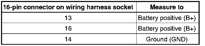 - Connector multimeter for voltage measurement to vehicle wiring harness 16-pin connector as follows: