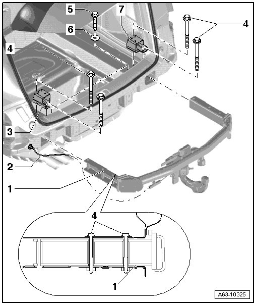 - Remove the bolts - 3 - and remove the trailer hitch to the rear.