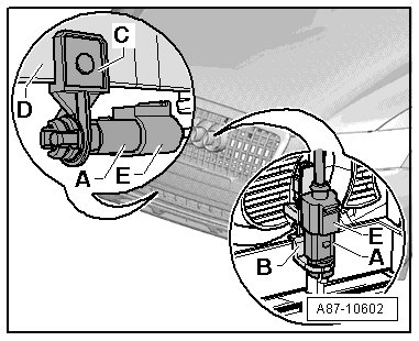 • The measured value can be too high on vehicles that have the outside air temperature sensor - A - and mount - B - installed on the air intake grille above the impact member. Install the outside air temperature sensor - A - and the revised bracket - C - slightly forward and under the bumper - D -. The wire connections may have to be lengthened. Refer to the Parts Catalog. The bracket - C - is clipped into the impact member - D -. It may be necessary to drill a 7 mm hole into the impact member - D -.
