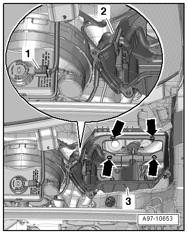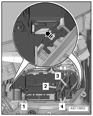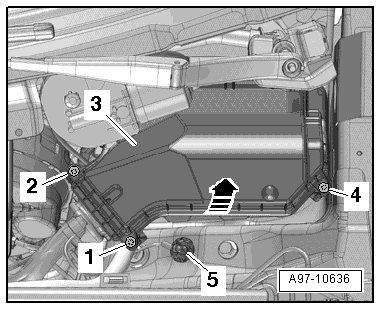- Remove the screws - 1, 2 and 4 - and remove the engine compartment E-box cover - 3 - - arrow -.