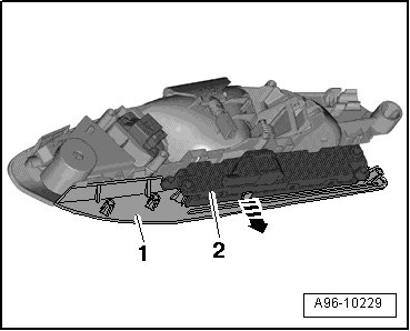 - Press retaining clips to side - arrow - and remove memory seat control head - 2 - from inside door release mechanism - 1 -.