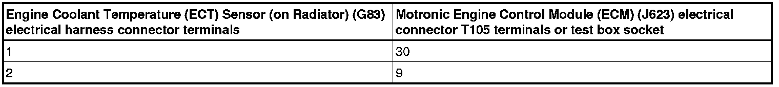 - Using a Multimeter , check the Engine Coolant Temperature (ECT) Sensor (on Radiator) (G83) electrical harness connector terminals to the Motronic Engine Control Module (ECM) (J623) electrical harness connector T105 terminals for an open circuit according to the wiring diagram.