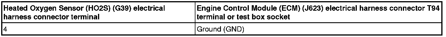 - Using a multimeter, check the Heated Oxygen Sensor (HO2S) (G39) electrical harness connector terminal 4 to Ground (GND) for voltage.