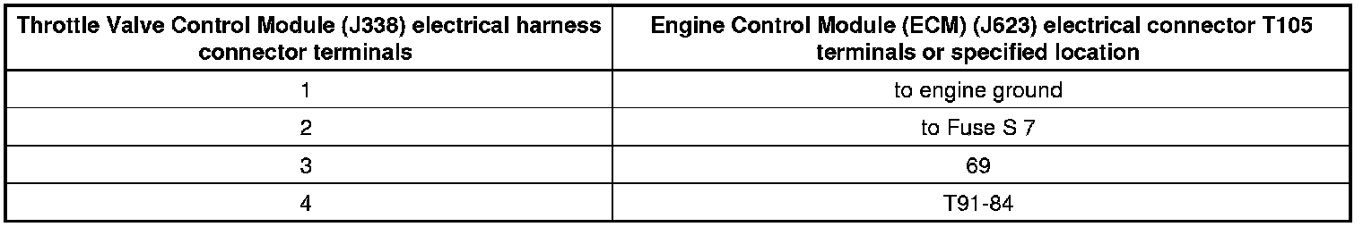 - Using a multimeter, measure the voltage between terminal 1 and 4 of the Throttle Valve Control Module (J338) electrical harness connector.