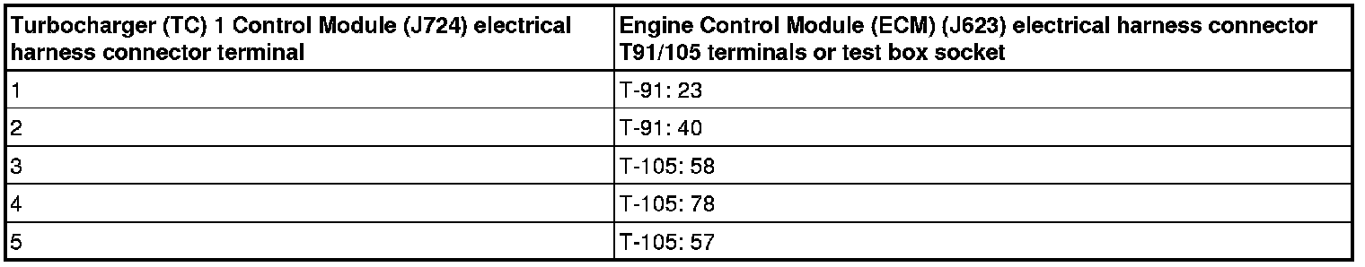 - Using a multimeter, check the Turbocharger (TC) 1 Control Module (J724) electrical harness connector to the Engine Control Module (ECM) (J623) electrical harness T91/105 connector for resistance.