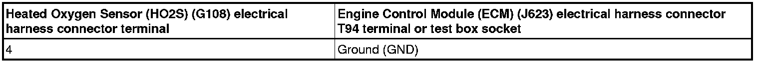 - Using a multimeter, check the Heated Oxygen Sensor (HO2S) (G108) electrical harness connector terminal 4 to Ground (GND) for voltage.