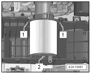 - Carefully guide both air filter elements into the grooves - 1 - and - 2 -.