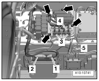 - Remove the right rear relay and fuse carrier from the control module bracket and lay it aside - arrows -.