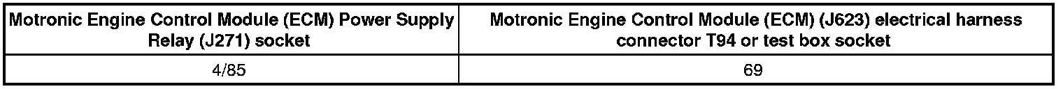 - Check the Motronic Engine Control Module (ECM) Power Supply Relay (J271) socket 4/85 to the Motronic Engine Control Module (ECM) (J623) electrical harness connector T94 terminal 69 for an open circuit or a short to Battery (+).