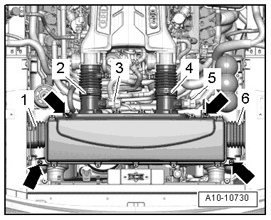 - Remove the left - 1 - and right - 3 - engine compartment trim.