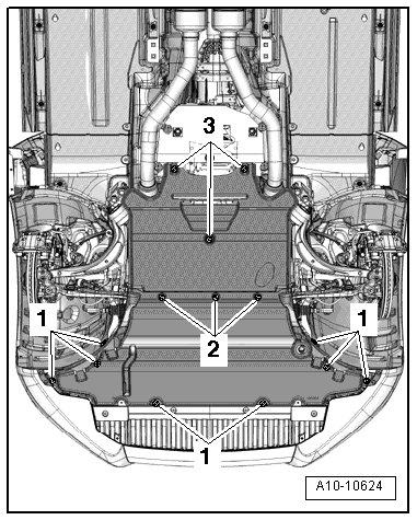 - Remove the noise insulation, to do this loosen the mounting parts - 1, 2, 3 -.