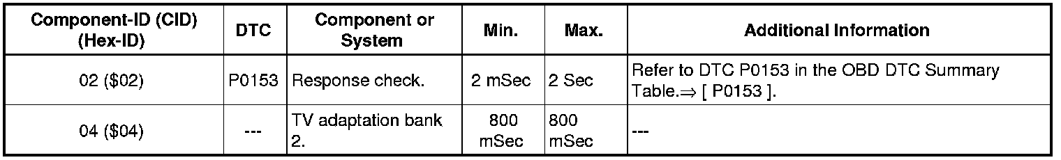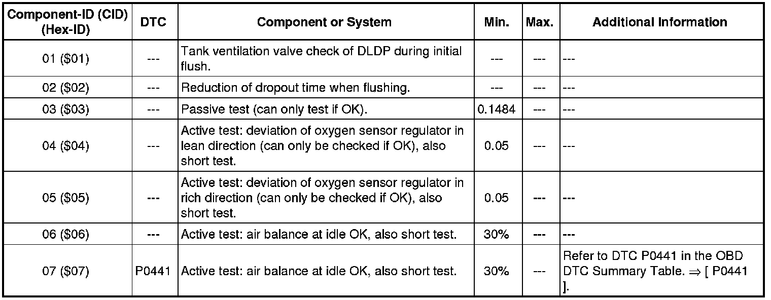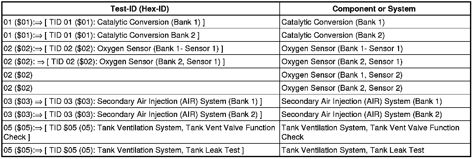 Depending on the scan tool and protocol used, the information displayed in Diagnostic Mode 06 may be referred to by different names such as Test-ID (TID), Hex-ID, Component-ID (CID), On-Board Diagnostic Monitor Identifier (OBDMID), or contain no name at all and may be referenced by only a number.