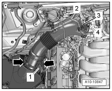 - Lay aside air guide pipe with connected crankcase ventilation hose - 2 - by loosening hose clamp - 4 - and opening clips - arrows -.