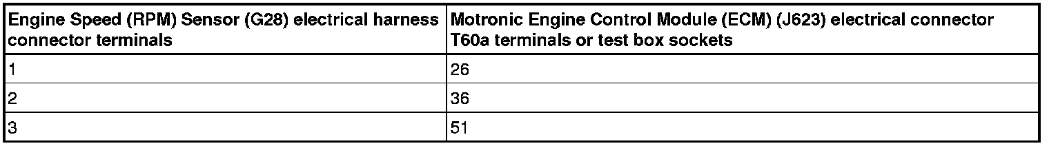 - Using a Multimeter, check the Engine Speed (RPM) Sensor (G28) electrical harness connector terminals to the Motronic Engine Control Module (ECM) (J623) electrical harness connector T60a terminals for an open circuit.