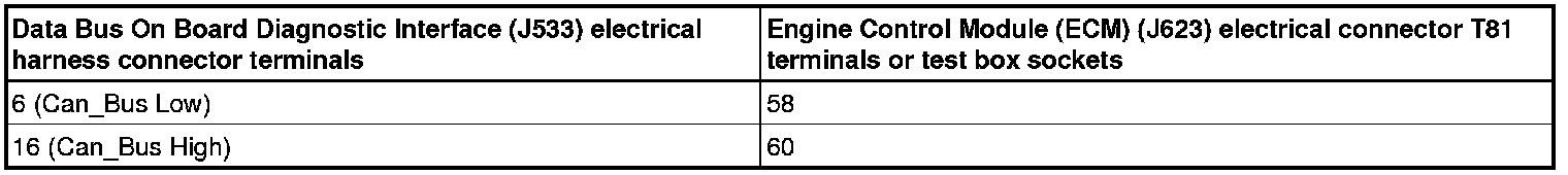 - Using a Multimeter, check the Data Bus On Board Diagnostic Interface (J533) electrical harness connector to the Engine Control Module (ECM) (J623) electrical harness connector T81 for resistance.