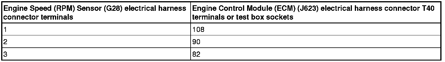 - Using a Multimeter, check the Engine Speed (RPM) Sensor (G28) electrical harness connector terminals to the Engine Control Module (ECM) (J623) electrical harness connector T40 terminals for resistance.