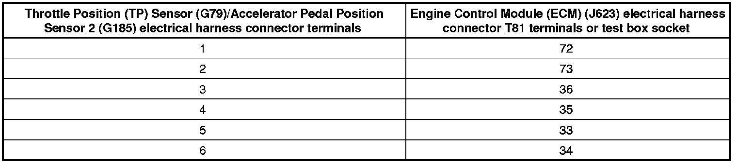 - Using a Multimeter, check the Throttle Position (TP) Sensor (G79)/Accelerator Pedal Position Sensor 2 (G185) electrical harness connector terminals to the Engine Control Module (ECM) (J623) electrical connector T121 for resistance.