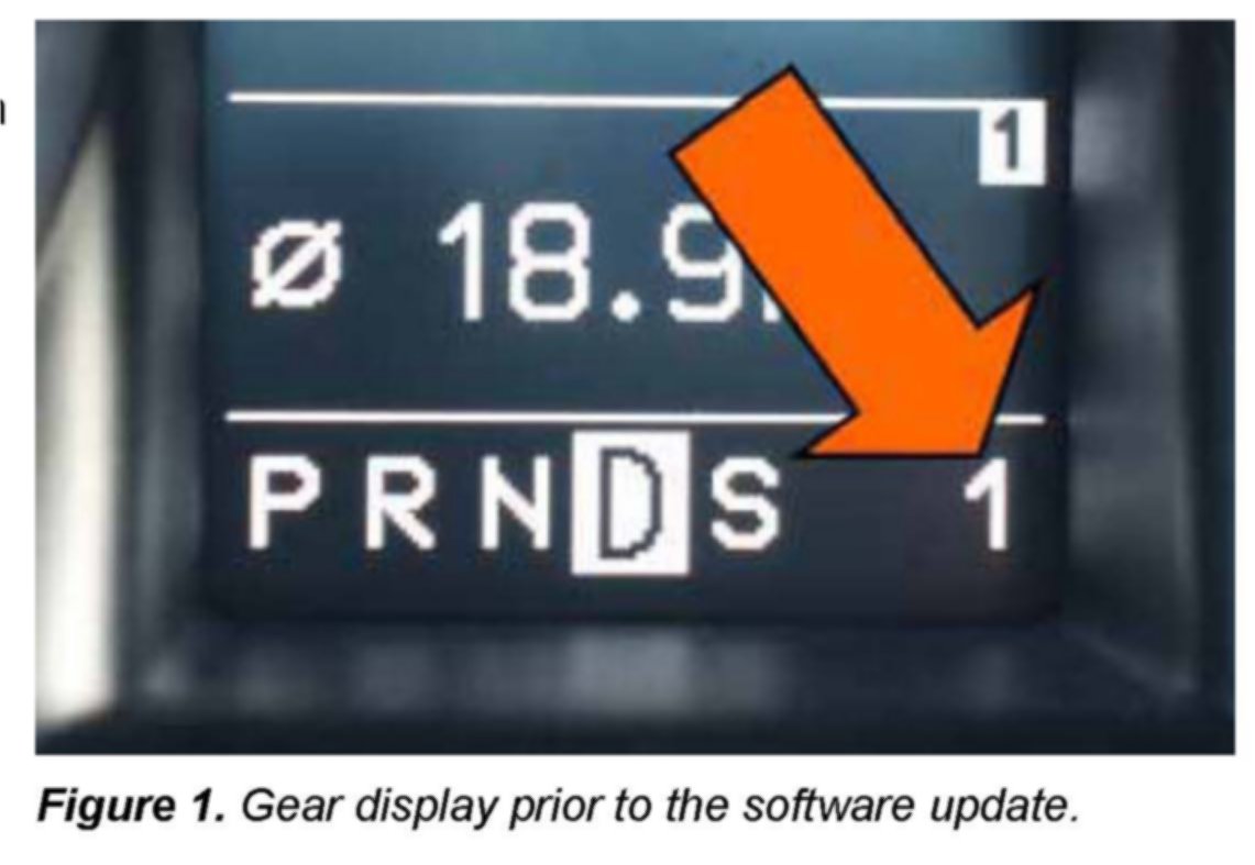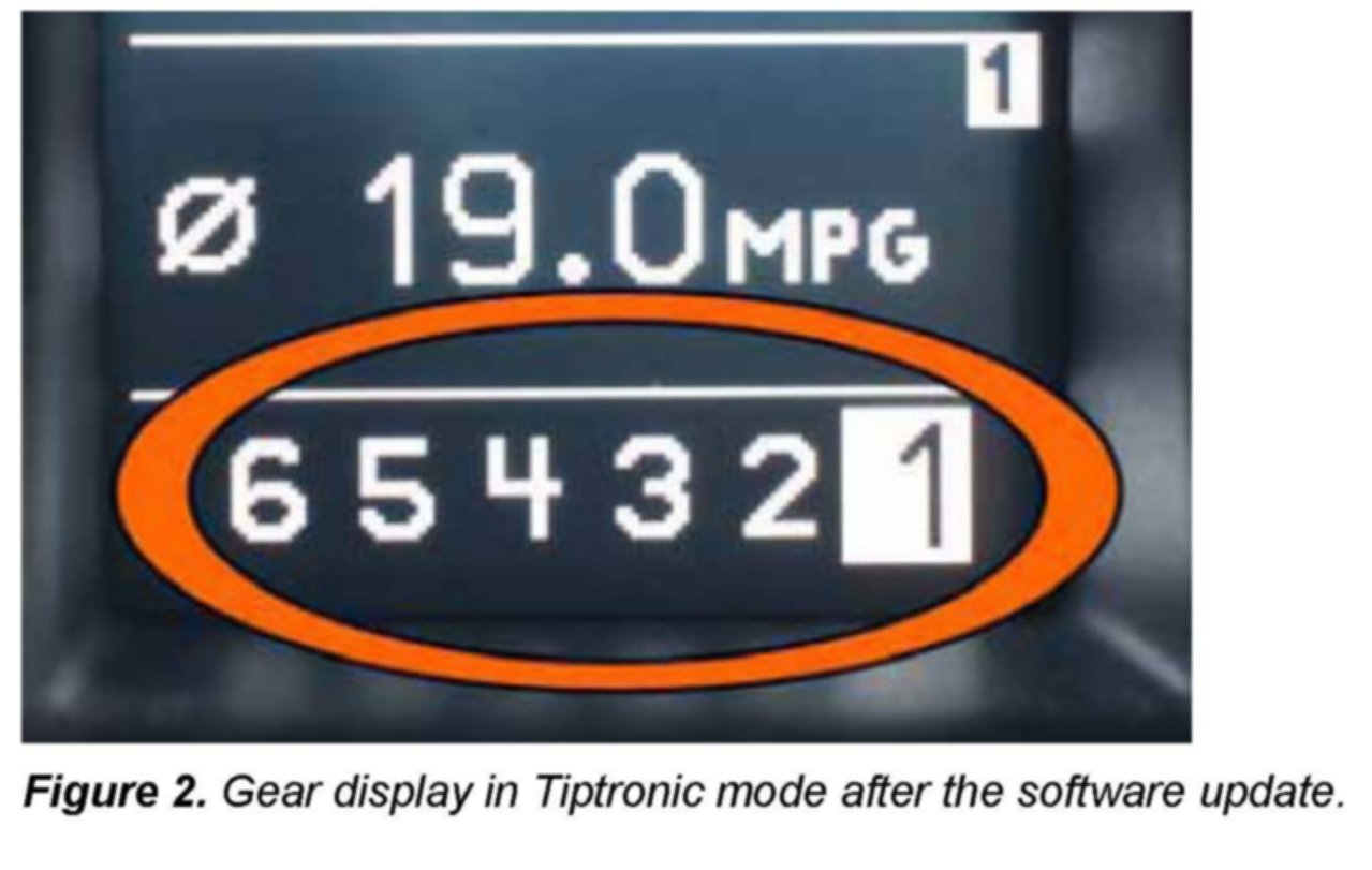 1. On MY 2009 vehicles: Before performing this update, please inform the customer that after the update the gear (1, 2, 3, 4, 5, or 6) will no longer be displayed in the driver information display (Figure 1) while in Drive "D" or Sport "S."