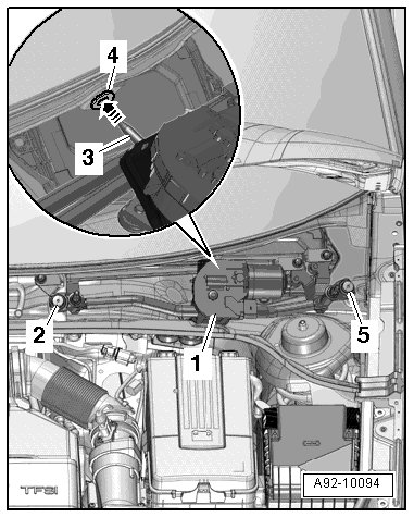 - Pull the wiper frame with the linkage and wiper motor - 1 - far enough forward until the retaining pin - 2 - no longer is inside the mount - 3 -.