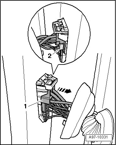 - Release door cut-off connector - 1 - and remove outward - arrow -, press securing guide - 2 - to do so.