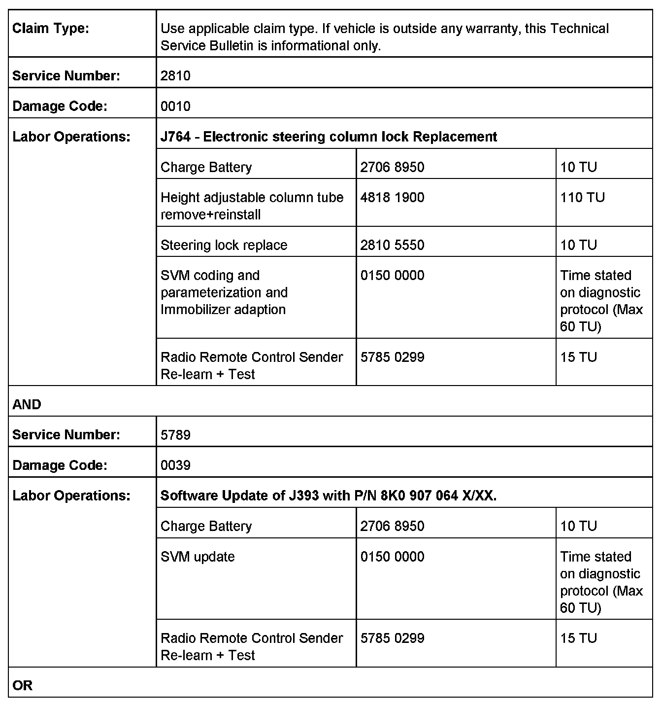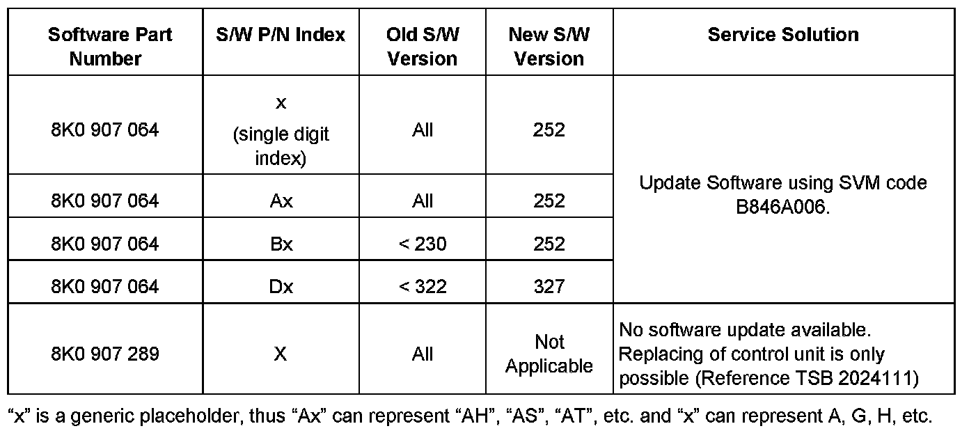 4. For P/N 8K0 907 064, if a software update is not possible or if the software level is already at the level listed in the table above, then replace the access and start authorization (J393) control unit. Please reference TSB 2024111 when replacing the control unit because an SVM Code will be required to perform the SVM coding and parameterization of the new control unit.