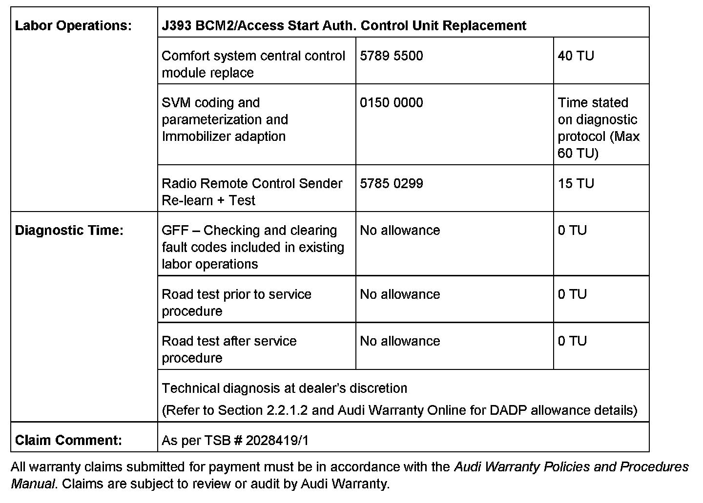 3. For an access start authorization control units (J393) with P/N 8K0 907 289, only replacing the hardware can be performed. Please reference TSB 2024111 when replacing the control unit because one or two SVM Codes will be required to perform the SVM coding and parameterization of the new control unit.