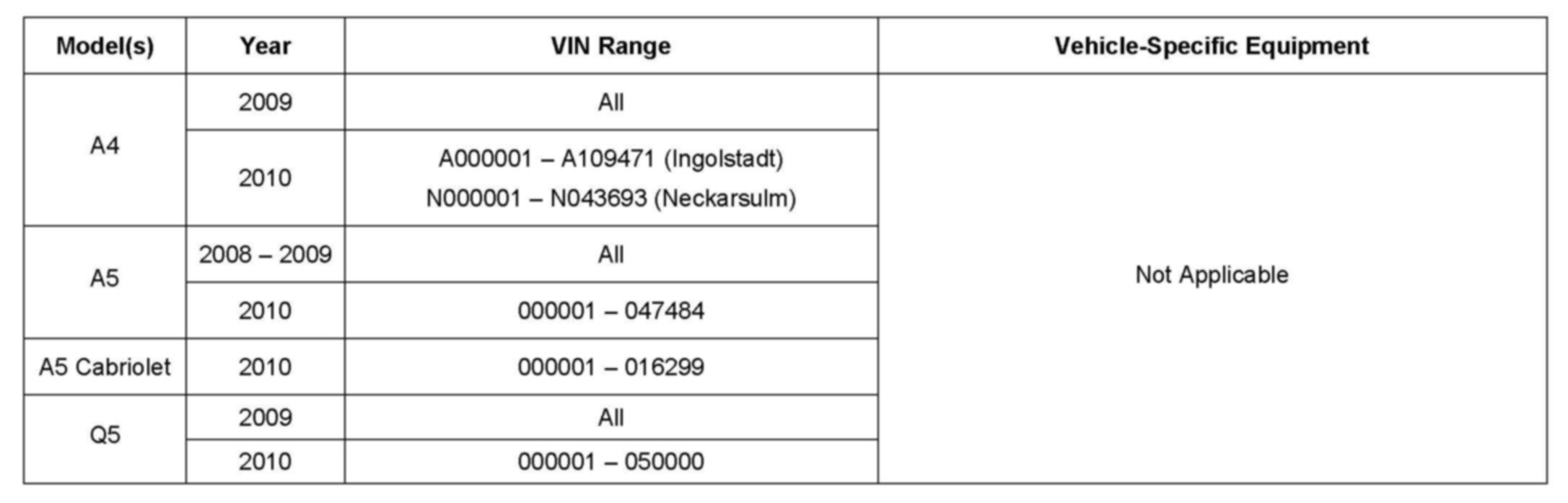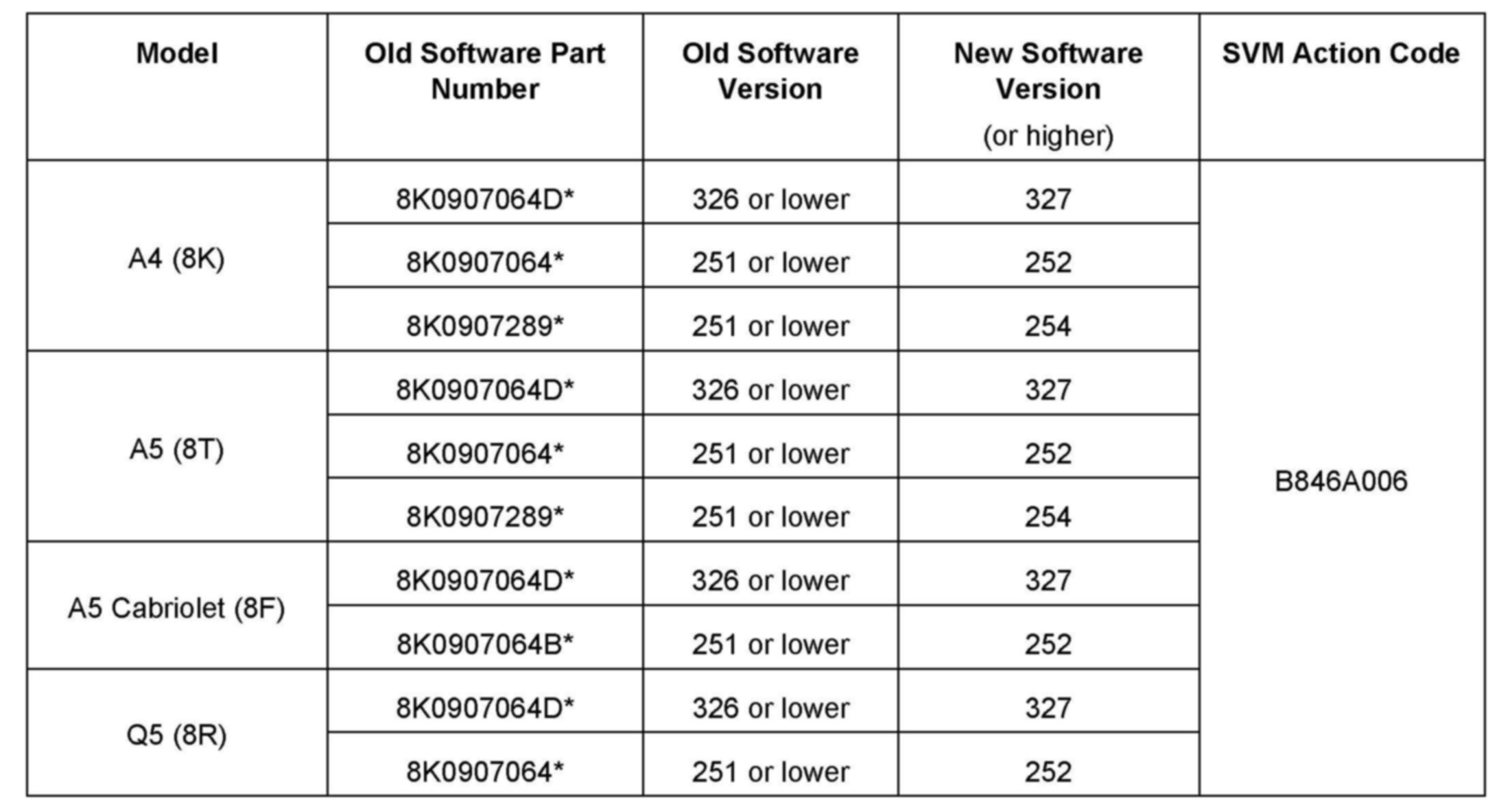 2. Update the convenience system control module (J393) using the SVM action code as listed in the table below, if necessary. If the software level is already at the level listed in the table, proceed to step 5.