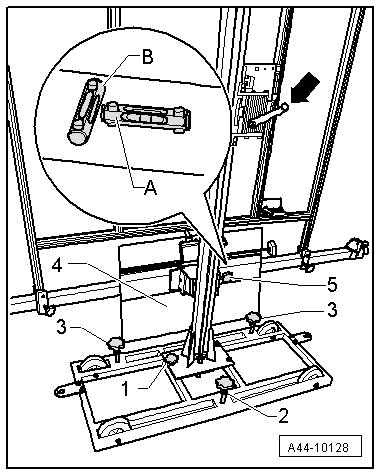 - Level the bubble levels - A - and - B - on the (VAS 6430) using the adjusting screws - 1 -, - 2 - and - 3 -.