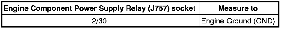 - Check the Engine Component Power Supply Relay (J757) socket 2/30 to the Battery (A) positive terminal for an open circuit or short to Ground (GND).