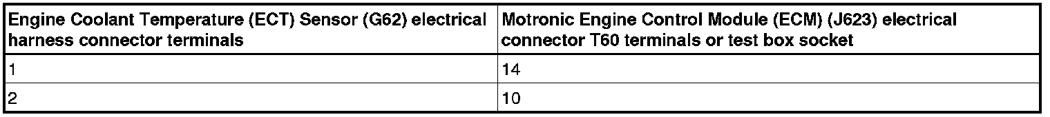 - Using a multimeter, check the Engine Coolant Temperature (ECT) Sensor (G62) terminals 1 to 2 for resistance.