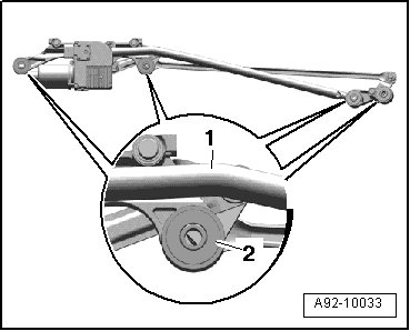 - Check whether all rubber bushings - 2 - are seated correctly in mounts on wiper frame - 1 -, press into mounts if necessary.