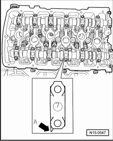 Points - arrow A - of intake and exhaust camshaft bearing caps face outwards.