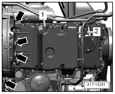 - Tighten oil pan - 1 - to cylinder block bolts diagonally to 12 Nm.