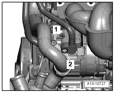 - Remove the bolts - 1 and 2 - and the refrigerant lines from the A/C compressor => [ Refrigerant Lines, Disconnecting from Compressor and Connecting ] Refrigerant Circuit.
