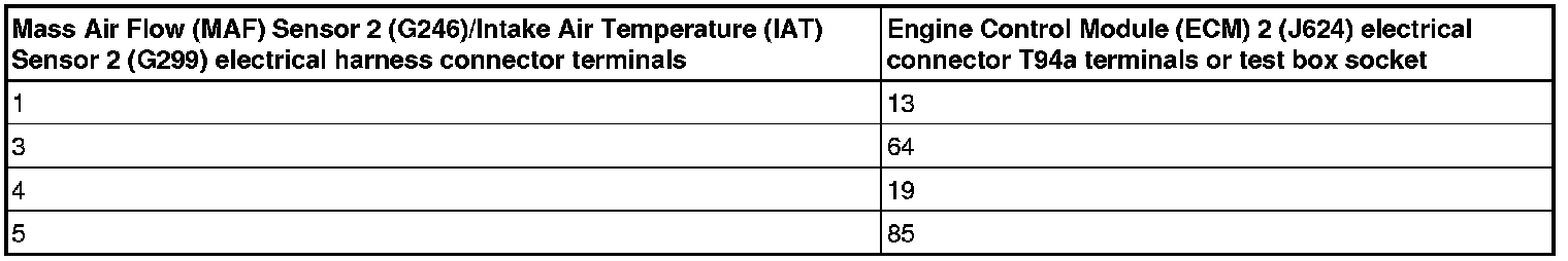 - Using a multimeter, check the Mass Air Flow (MAF) Sensor 2 (G246)/Intake Air Temperature (IAT) Sensor 2 (G299) electrical harness connector terminals to the Engine Control Module (ECM) 2 (J624) electrical harness connector T94a terminals for resistance.