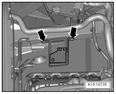- Remove the bolt - arrows - and the coolant reservoir bracket.