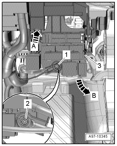 - Release the retaining spring - arrow A - and tilt the relay/fuse panel - 3 - out of the mount - arrow B -.