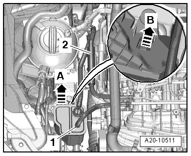 - Release the EVAP canister - B arrow -, remove it upward - A arrow - and lay it aside.