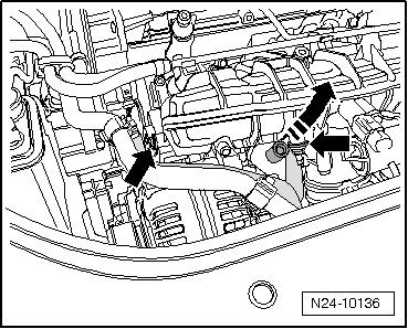 - Disconnect coolant pipe and oil dipstick guide from intake manifold - arrows - and pull off oil dipstick guide upward from engine.