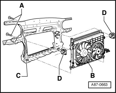 - Remove the radiator fan - B - with the mount (for example on 2.0L gasoline vehicles).