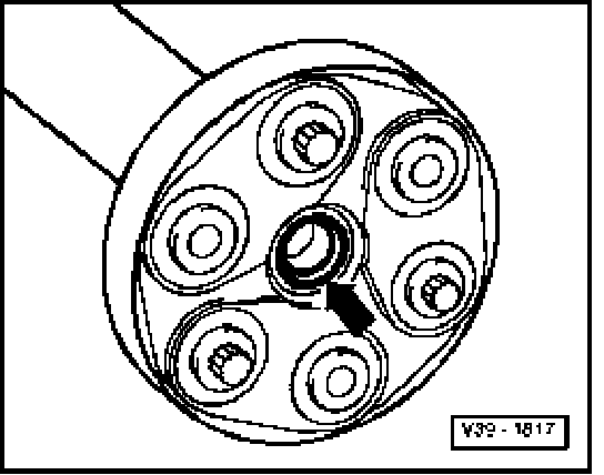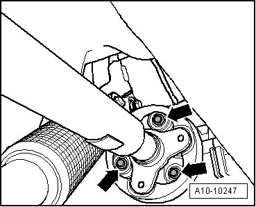 - Remove the driveshaft flexible disc bolts - arrows - from the bevel box while counter holding at the triangular flange with a lever.